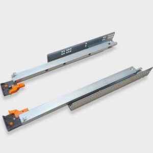ساختار این نوع ریلها نیز به این صورت میباشد که در زیر بدنه هر جعبه یک ریل نصب شده و لنگه دیگر آن بر روی بدنه کار (میز آرایش و کابینت و ….) از داخل نصب میگردد. در ریلهای ساچمهای ضامنی داخل ریل تعبیه شده است که از جدا شدن رو قسمت ریل و به عبارت بهتر از خارج شدن کامل کشو از داخل کار جلوگیری مینماید. برای خارج کردن کامل کشو از محوطه مخصوص آن کافی است ضامنهای ریل را یافته و آنها را به بالا و یا پایین حرکت دهیم تا کشو آزاد گردد.